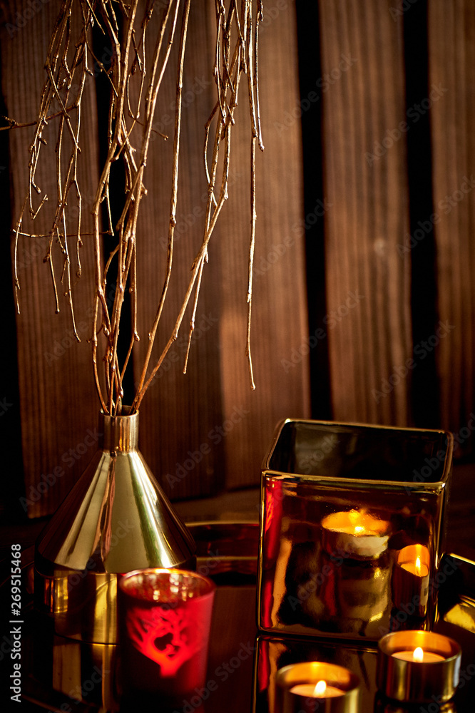 Cozy decor. Gold and red. Burning candles, Golden vessels