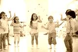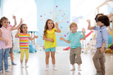 Happy children having fun dancing indoors in a sunny room at day care or entertainment center