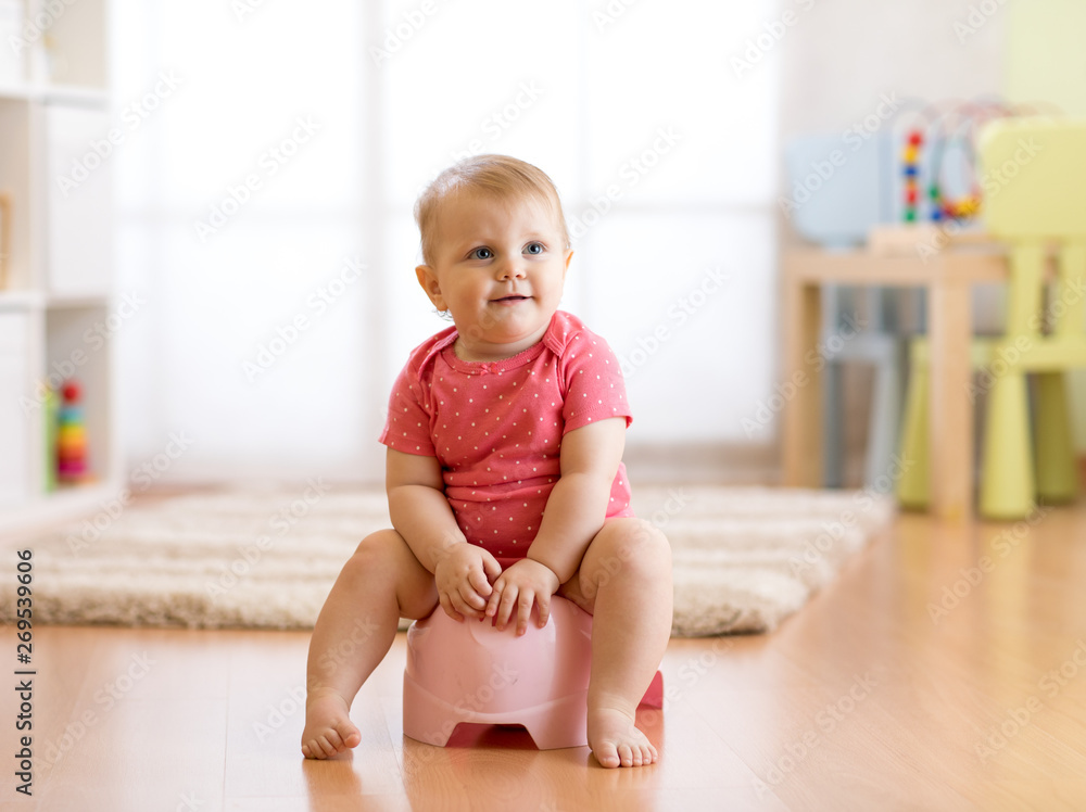 Little smiling baby girl sitting on a pot. Isolated on white background.