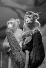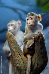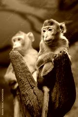 Very thoughtful young monkey on a tree trunk