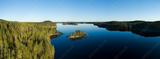 Aerial early clear summer day in finland with green forest, islands and blue water lakes and clear blue sky. Beautiful Finnish nature.