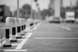 Car parking safety bar in the area of shopping center. Empty parking lot at the city centre