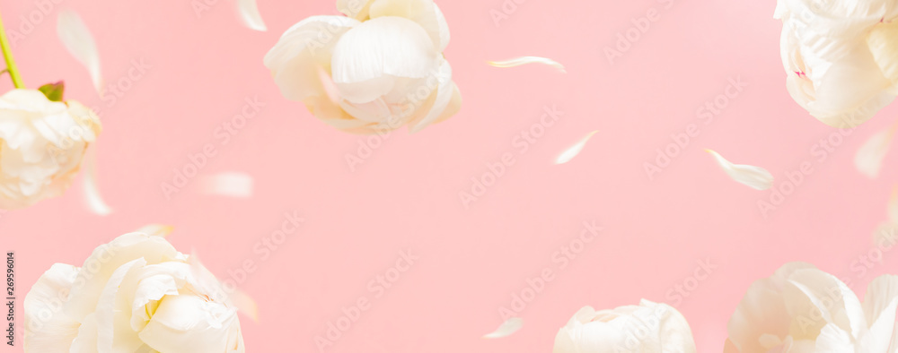 Beautiful flying white peonies flowers and petals at light pink pastel background with copy space. Creative floral nature spring layout. Spring blossom background. Long wide banner