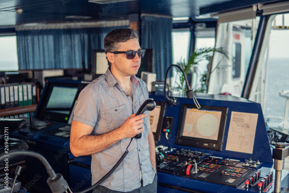 Marine navigational officer is reporting by VHF radio during navigation watch. Bridge GMDSS watch