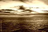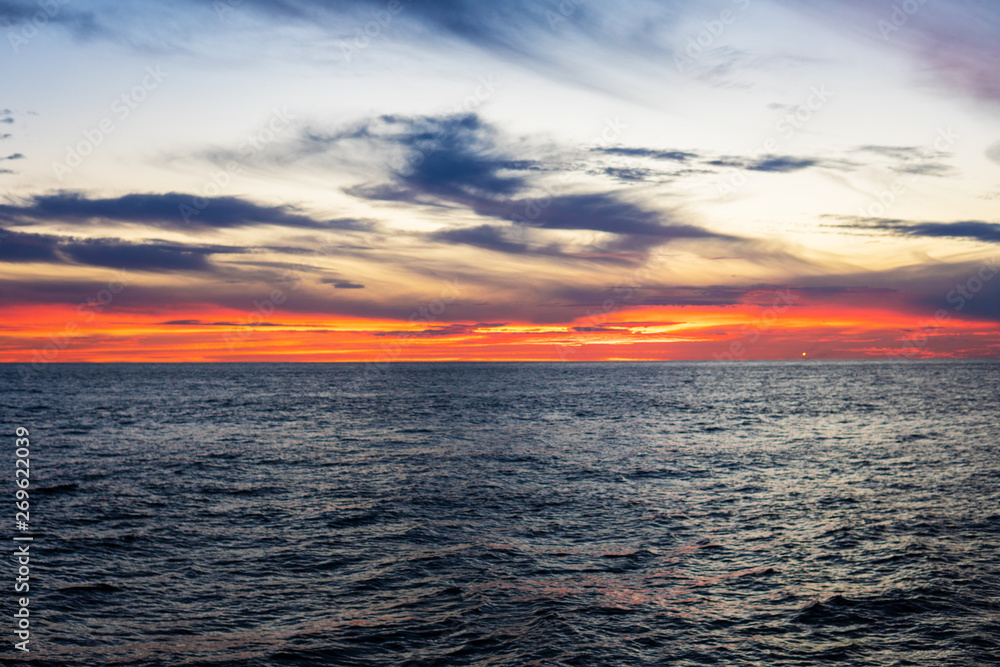 Amazing sunset, sea, the sun with clouds and sun reflection. Open ocean view from boat