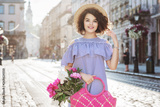 Outdoor summer portrait of young beautiful happy smiling lady wearing trendy striped dress, straw hat, holding wicker bag with peonies, woman posing in street of old European city. Copy, empty space