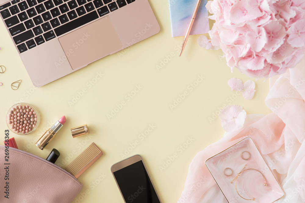 Top view of woman beauty working desk with computer keyboard and laptop, notebook, decorative cosmetic, flowers and palm leaves, envelope on pink and white pastel table. Flat lay background.