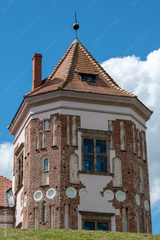 Mir, Belarus, April 24, 2019: The ancient tower of the Mir castle, historic sites