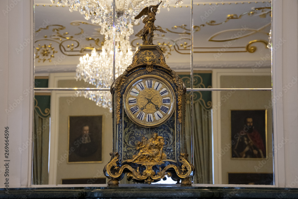 Mir, Belarus, April 24, 2019: Old clock on the fireplace in front of the mirror