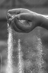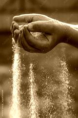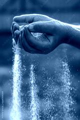 Children's hands release the falling sand. Sand flowing through your hands in the sunset sunlight.
