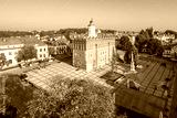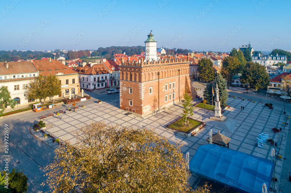 Sandomierz old city, Poland. Aerial view in sunrise light. Gothic city hall with clock tower and Renaissance attic and St Mary statue in the market Square (Rynek). One of the oldest towns in Poland.