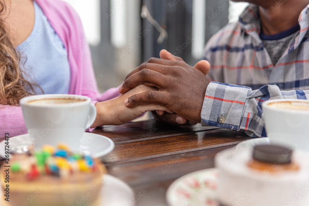 Two hands in love meet in front of sweets and coffee