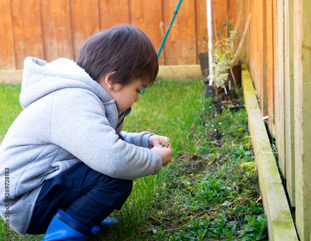4 years boy playing with wild flowers in the garden, Kid boy having fun with activities in backyard