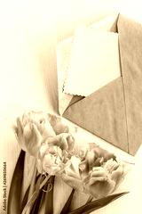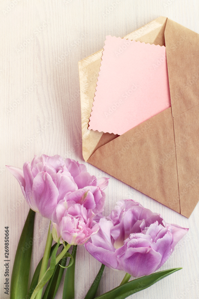 bouquet of tulips on the table next to the open envelope and a blank liner. background for holiday greetings