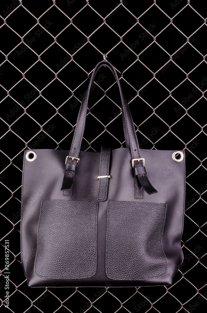 Bright fashion ladies accessories. Stylish black leather handbags or shopper bag on metal grid on black background. Copy Space. Mock Up.