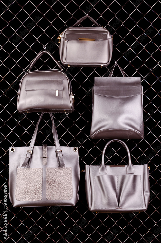 Bright fashion collection of ladies accessories. Stylish silver leather handbags on metal grid on black background. Copy Space. Mock Up.