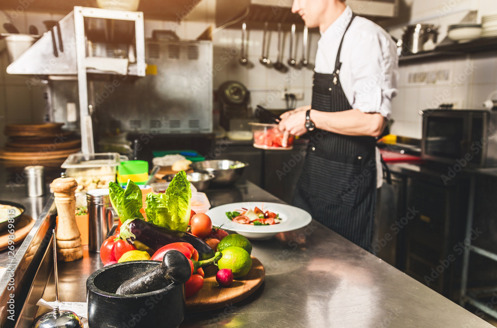 Professional chef cooking in the kitchen restaurant at the hotel, preparing dinner. A cook in an apron makes a salad of vegetables and pizza.