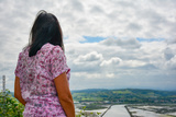 Brunette woman observing nature in Cantabria (Saja river), Spain
