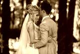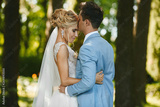 Beautiful blonde model woman with luxury jewelry in her wedding hairstyle and in fashionable dress hugs with the handsome groom in the stylish blue blazer outdoors