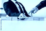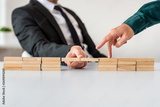 Businessman making a bridge of wooden blocks for his partner