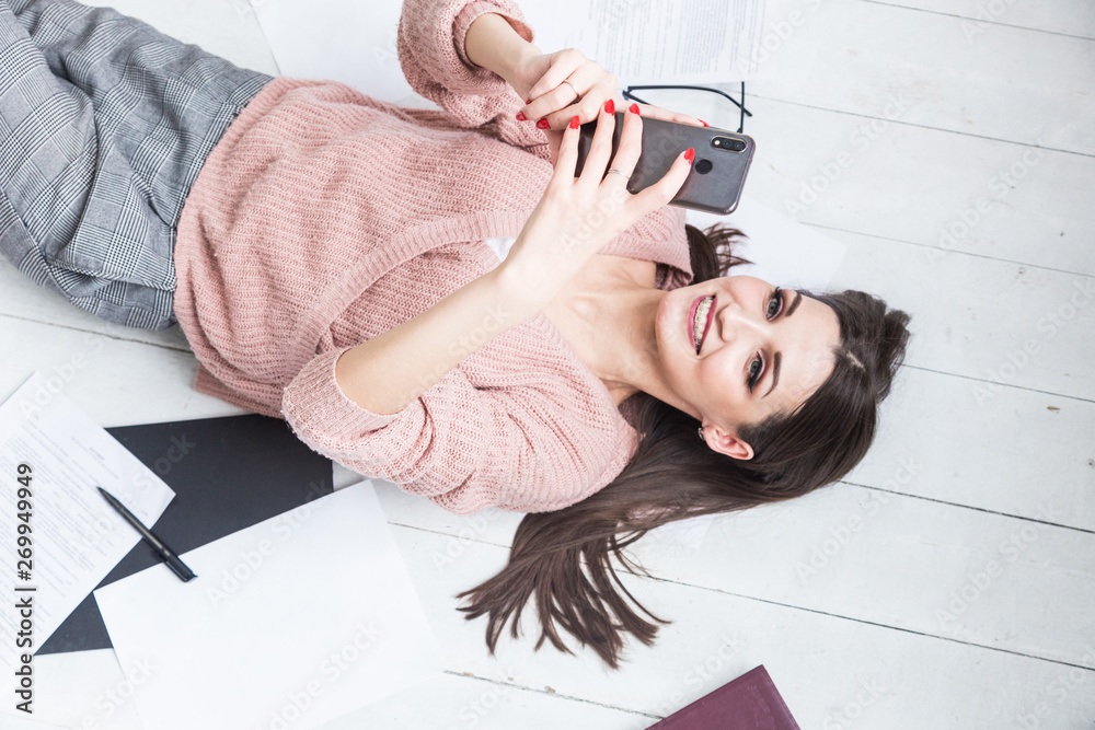A beautiful woman lies on the floor among papers and documents, the girl freelancer smiles and relaxes during a break from work