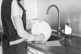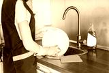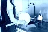 A young woman in yellow gloves washes dishes with a sponge in the sink. House professional cleaning service.