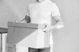 Delivery strong, muscular man loading cardboard boxes for moving to an apartment. professional worker of transportation, male loaders in overalls. free space for text, isolated