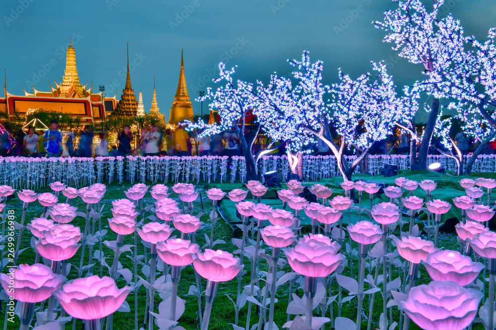 Beautiful colors of flowers decorated with lights in Celebrate the coronation of king Rama X (King Maha Vajiralongkorn) in Sanam Luang, Bangkok,Thailand