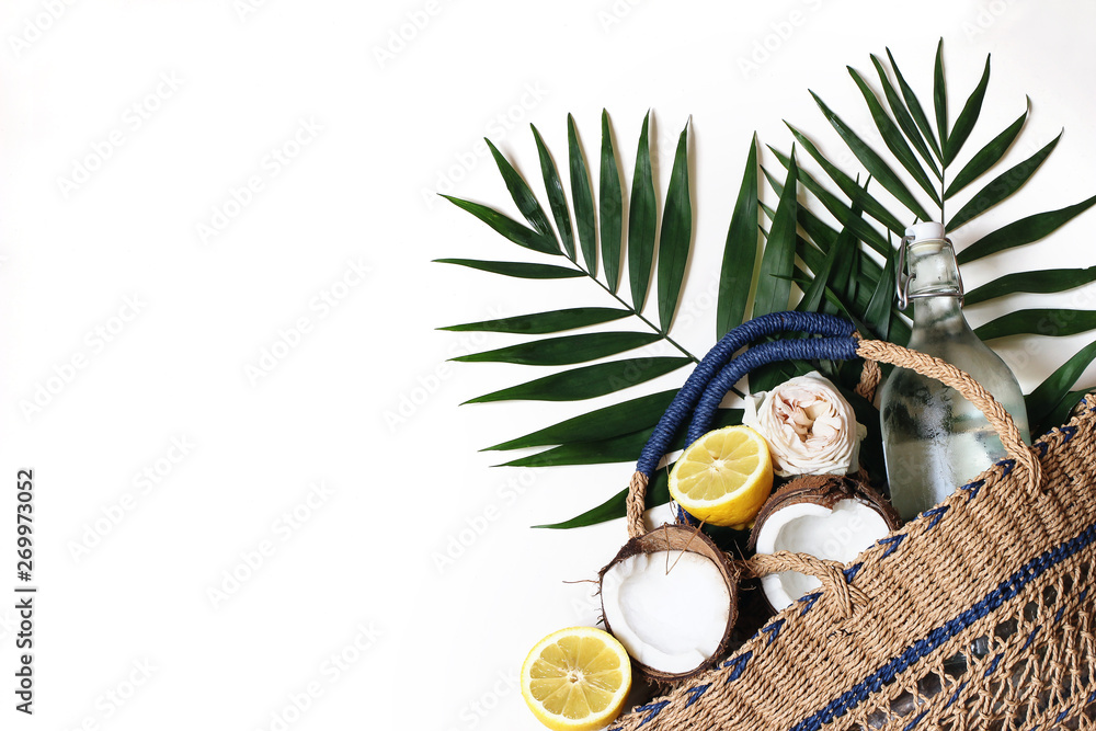 Summer still life composition with straw basket bag, lush palm leaves, lemons, coconut and glass bottle of water isolated on white background. Tropical design, picnic concept. Flat lay, top view.