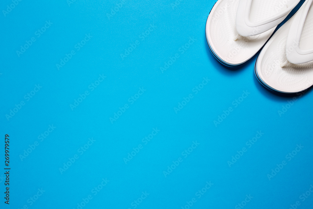 Flip flops on a blue isolated background. White female flip flops.