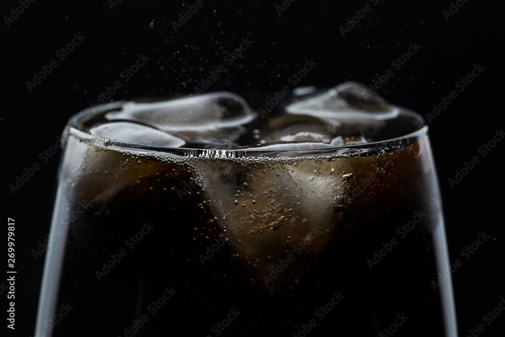 Glass of pouring fizzy drink with ice on a black background