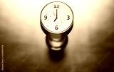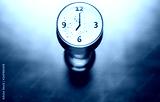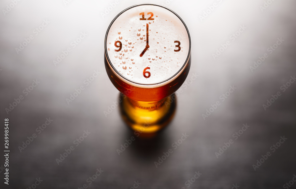 Time for beer concept. Clock or watch symbol on beer glass foam on black table, view from above