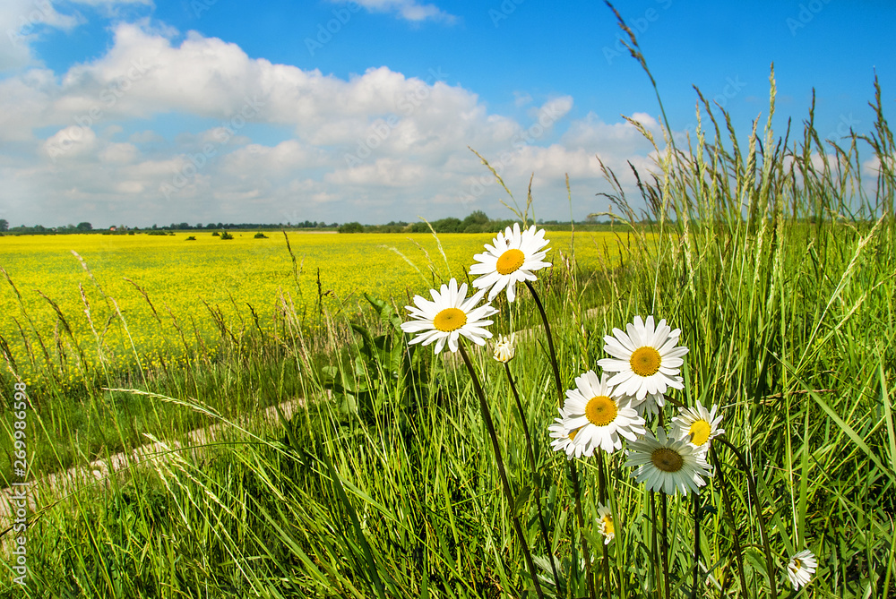polne kwiaty i pole rzepaku, piękny krajobraz