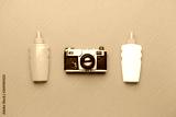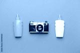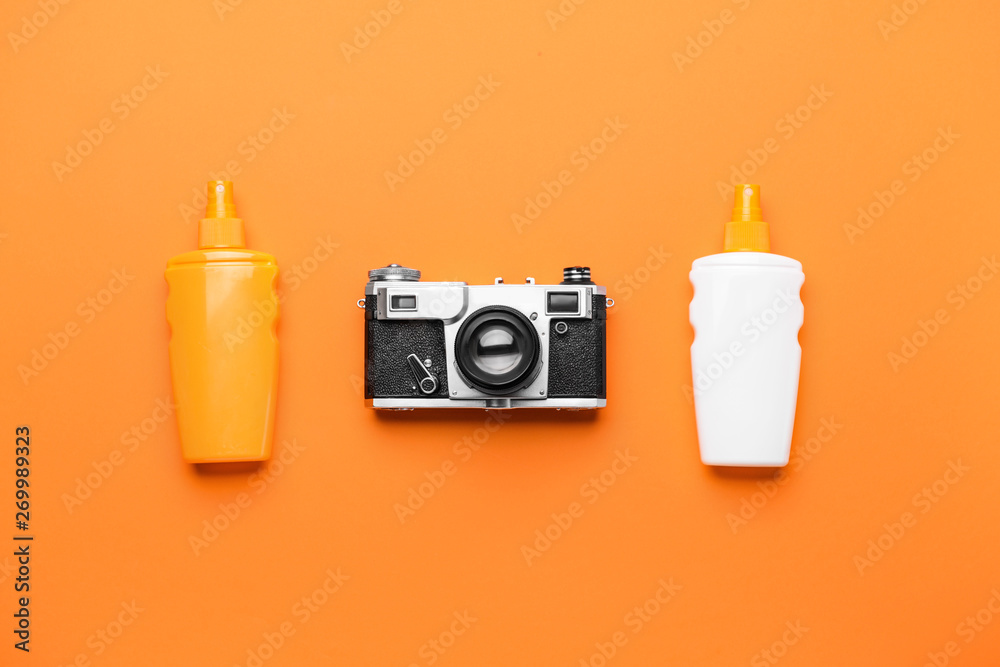 Assortment of sun protection creams and photo camera on color background