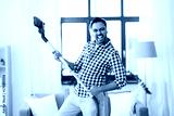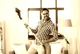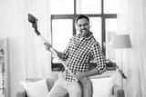 household and cleaning concept - indian man in headphones with vacuum cleaner having fun at home