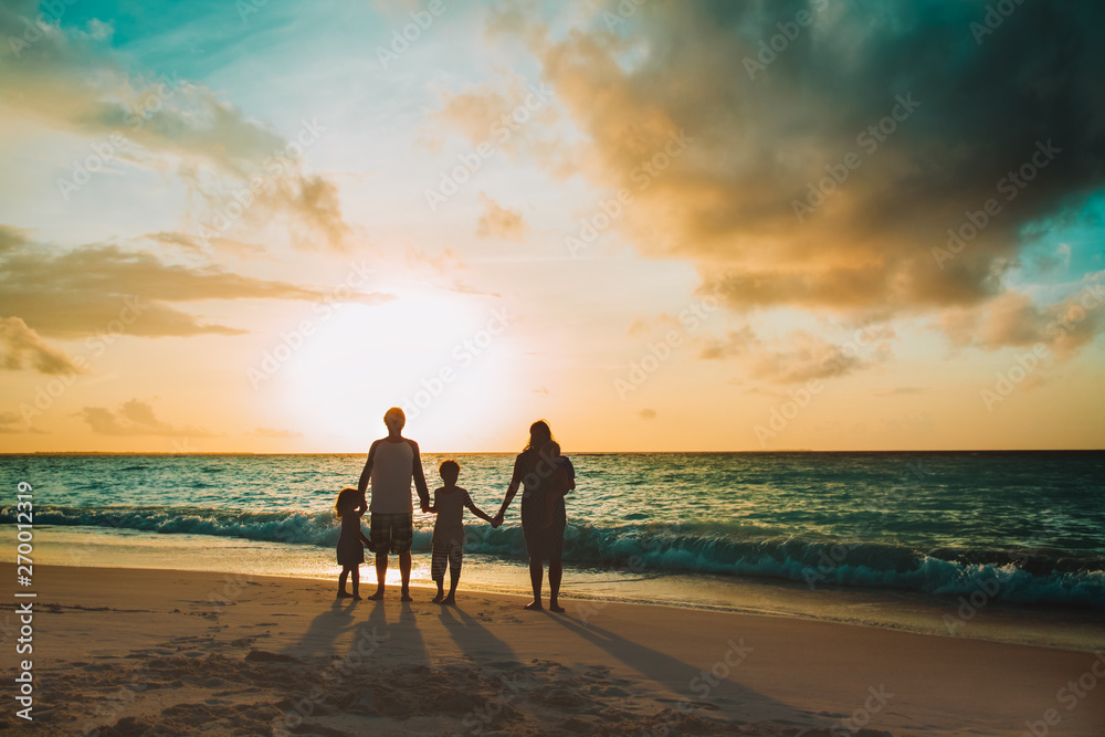 happy family with tree kids walk at sunset beach