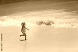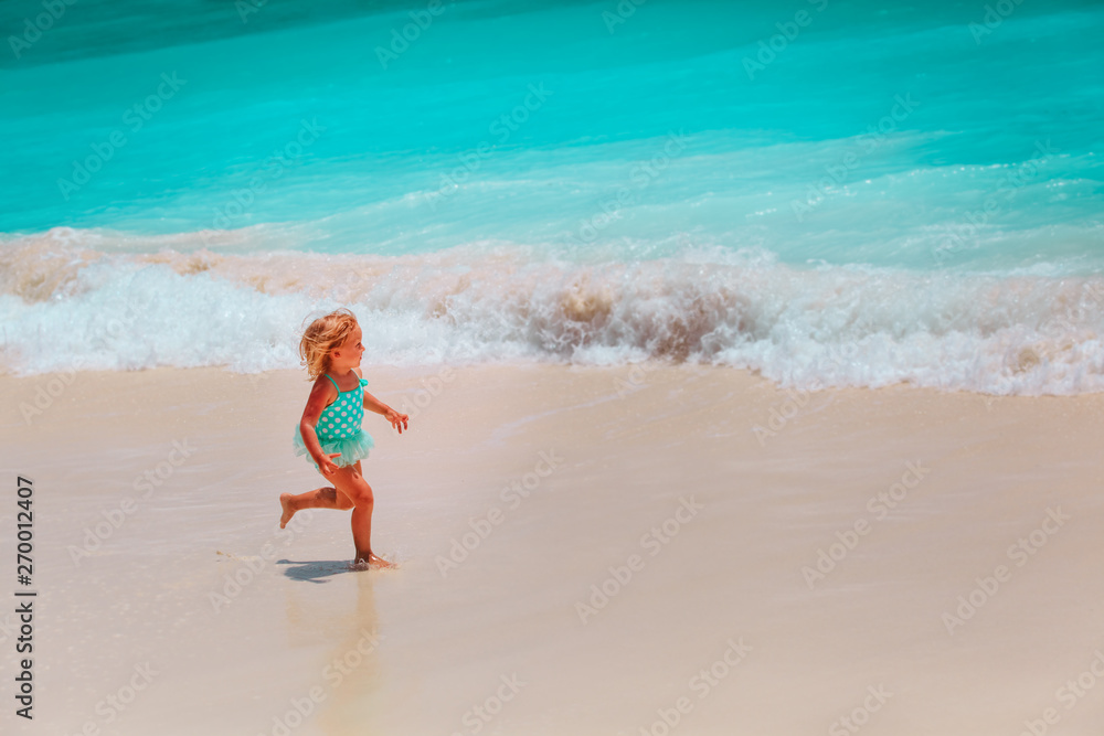happy little girl run play with waves on the beach