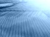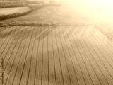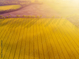 Aerial view of yellow canola field and distant country road, tree line with long shadows at sunrise