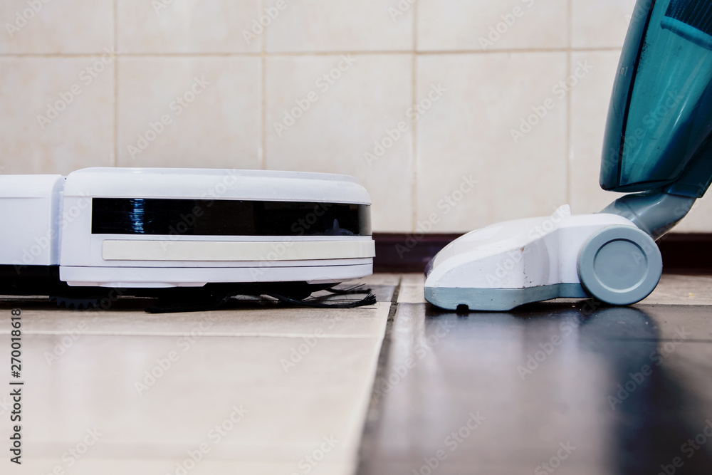 Modern robot vacuum cleaner in front of ordinary vacuum cleaner with handle, tiled floor