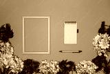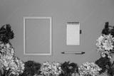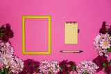 Design concept - top view of blank notebook page and ballpoint pen and spring flowers isolated on pink background with yellow frame for mockup