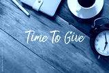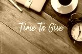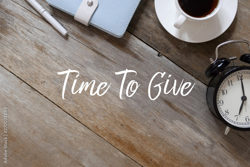 Top view of pen,notebook,coffee and clock on wooden background written with Time To Give.