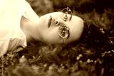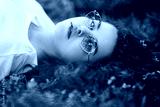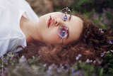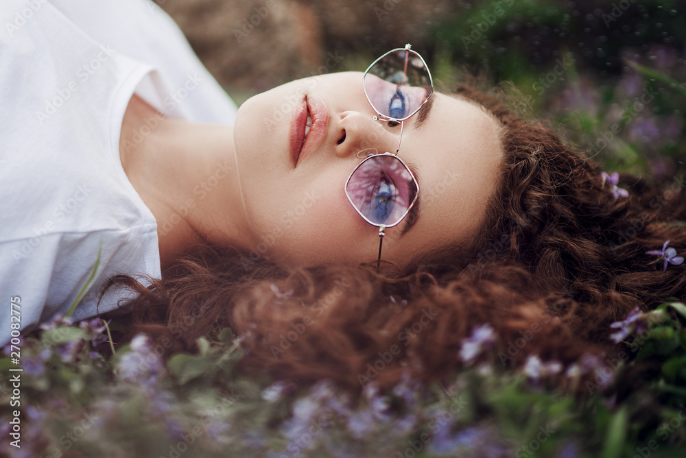 Outdoor close up portrait of young beautiful girl wearing stylish purple sunglasses lying on the meadow with violets.