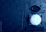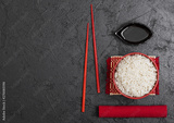 Red bowl with boiled organic basmati jasmine rice with red chopsticks and sweet soy sauce on bamboo placemat with red linen towel on black stone background. Space for text
