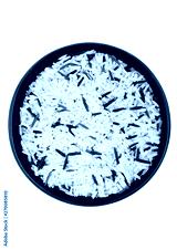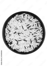 Black bowl of raw organic basmati long grain and wild rice on white background. Healthy food.