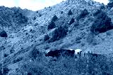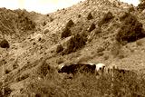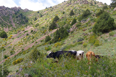 Cows graze on the slopes of the mountains of Uzbekistan, mountain landscape