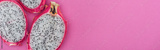 panoramic shot of exotic ripe dragon fruit halves on pink background