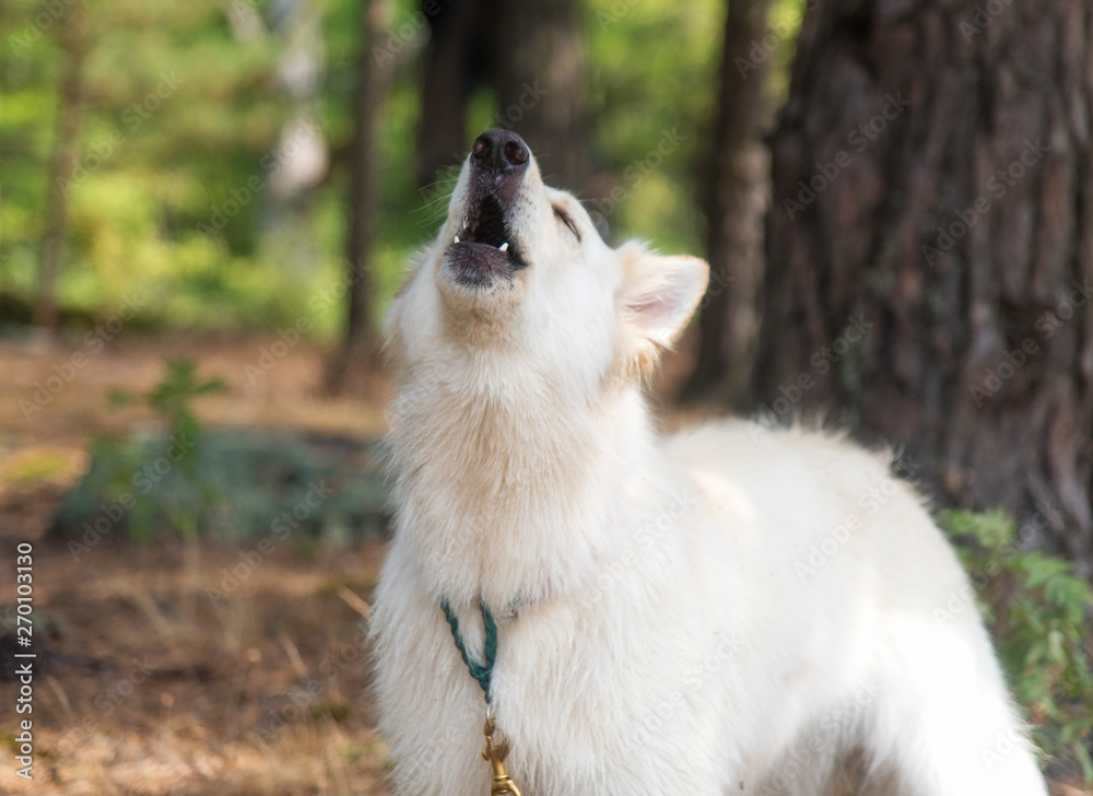 Chien berger blanc suisse in summer forest the dog howls and barks