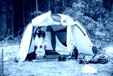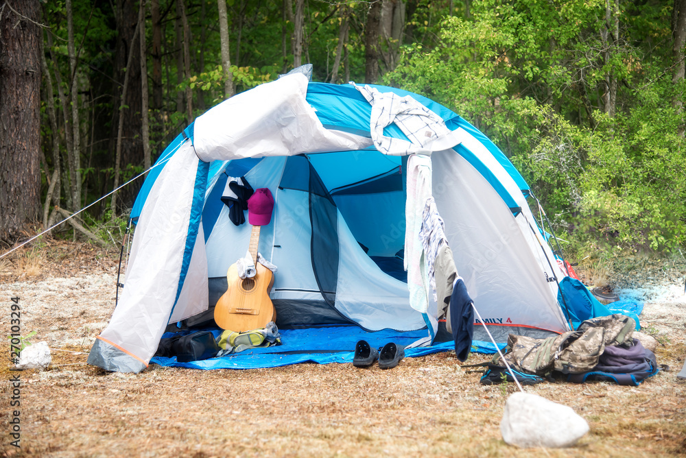 Tent Camping Campsite In The Woods. Wilderness Camping Concept Summertime.