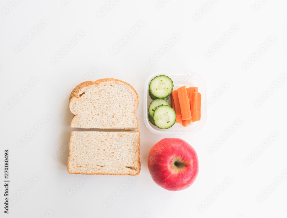 High angle view of brown bread sandwich, red apple, cucumber and carrots on white background - healthy packed lunch concept
