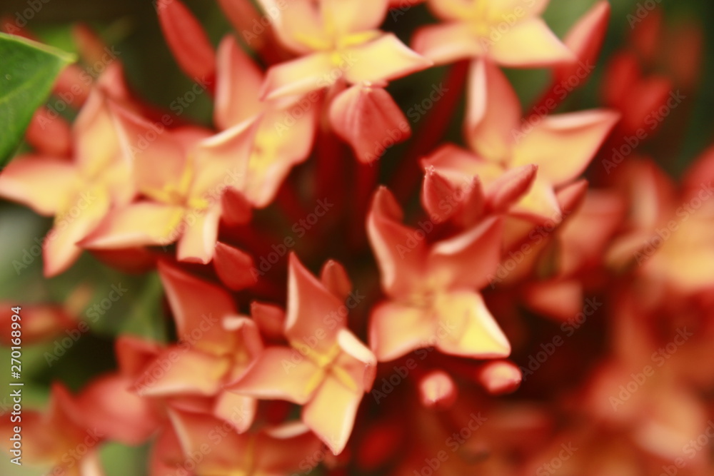 Macro closeup shot of a group of orange indian Ixora flowers, Other common names include viruchi, rangan, kheme, ponna, chann tanea, techi, pan, siantan, jarum-jarum/jejarum, jungle flame, jungle gera